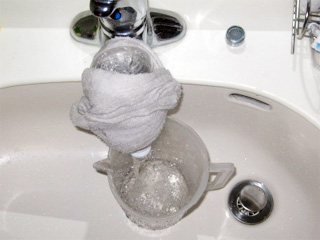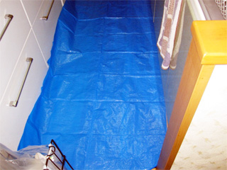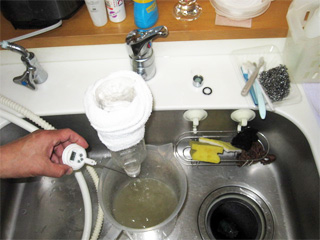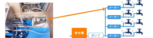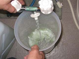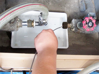 各戸メーター廻りに注入ホースを接続し、洗浄水投入、滞留、排出の順で部屋内の配管を洗浄します。