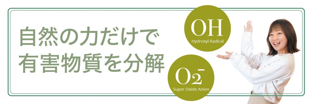 1967年に日本の大学の研究で発見された、世界に誇る環境技術です。酸化チタンに光が当たると、空気中の酸素や、水分に反応し、その酸化チタン・表面で活性酸素または活性水酸基が発生。それらが酸化チタンに接触する有機物(臭い・菌類・ウィルス・VOCガスなどの有害物質)を酸化分解あるいは不活化させる作用です。ナノゾーンソリューションは、ナノゾーン社が独自に開発したナノレベルの超微粒子酸化チタンを使用することで、 屋内の蛍光灯などわずかな光でも効果を発揮し効果が長期間持続します。
