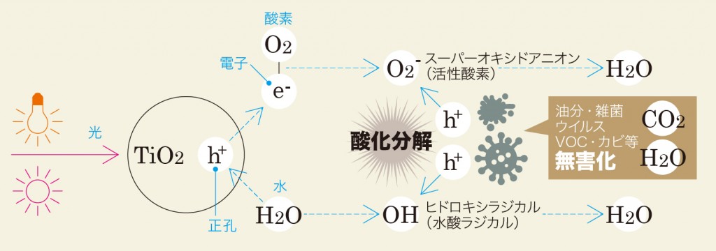 光を受けて電子の動きが活発化し半導体となった酸化チタンの表面では、水と酸素が塩素や次亜塩素酸の約2倍の強力な酸化力をもつOHラジカルとスーパーオキシドアニオンが発生。この二つの物質の強力な酸化分解力で空気中の有機物(ニオイの原因物質・細菌・ウイルス・VOCなど)の分子結合を切断し、最終的に二酸化炭素や水などの無害な物質に変化させることで除菌・消臭が行われます。