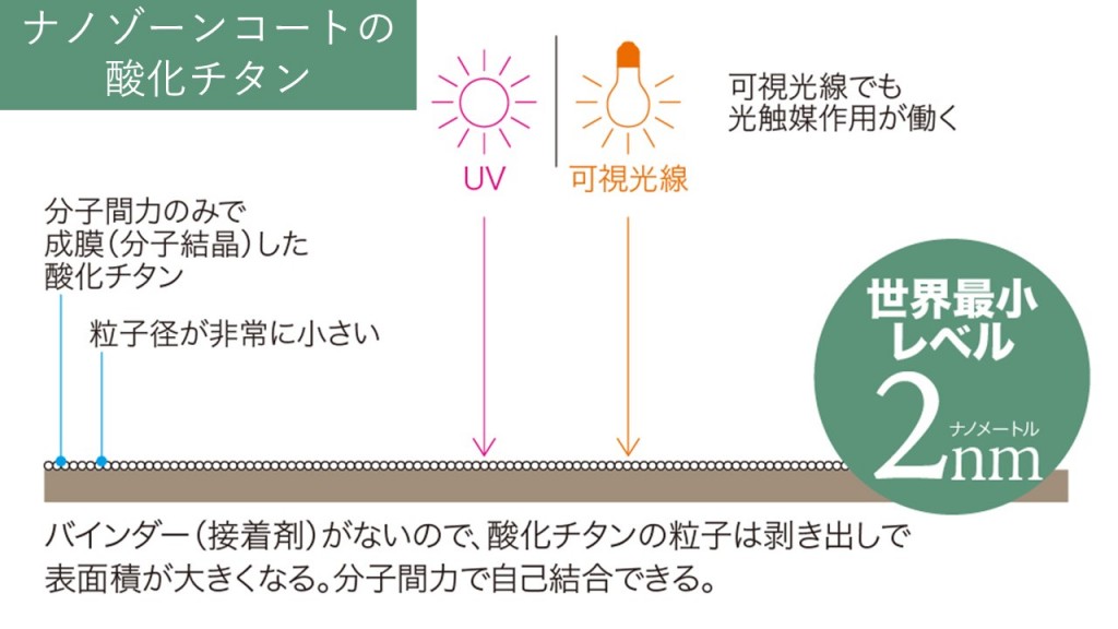 a_20世界最小レベル2ナノの酸化チタンが、室内の微弱な蛍光灯や一瞬の光でも効果を発揮。